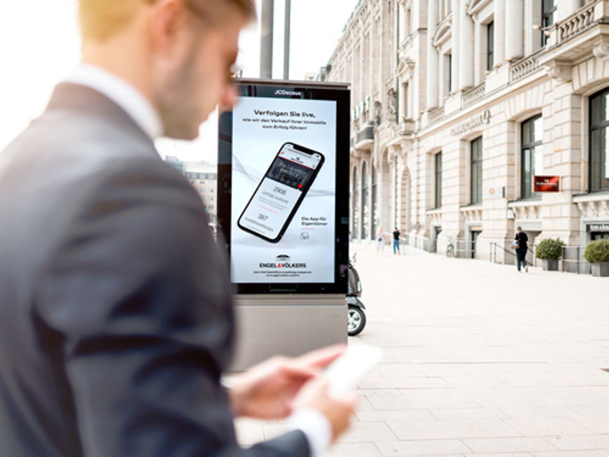 An innovative product deserves innovative advertising campaigns. For this reason, the new Engel & Völkers app will be presented to pedestrians in Hamburg's city centre in the form of high-quality advertising spots. The company has booked a total of 40 Citylight poster-type digital advertising spaces for this event, and with this contemporary appearance, it takes account of its product and of its core values of "Competence. Exclusivity. Passion." This unique campaign is also a premiere for the company, as Engel & Völkers has never made outdoor advertising for a digital product before.