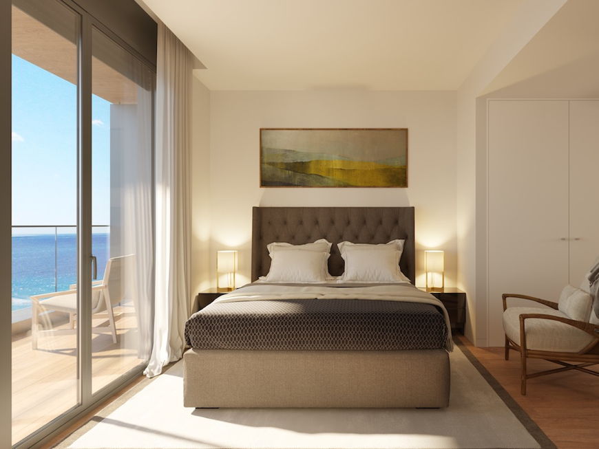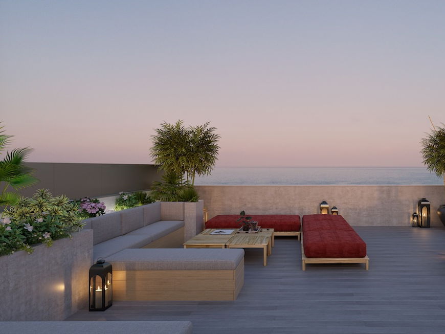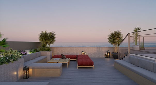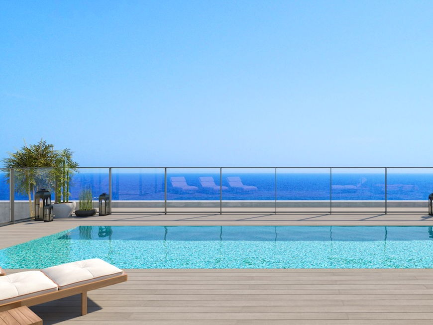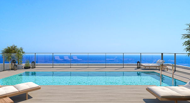 Las piscinas comunitarias situadas en lo alto de cada edificio se extienden como una segunda playa en altura y su solárium privado te hará sentir en tu propio Mediterráneo.