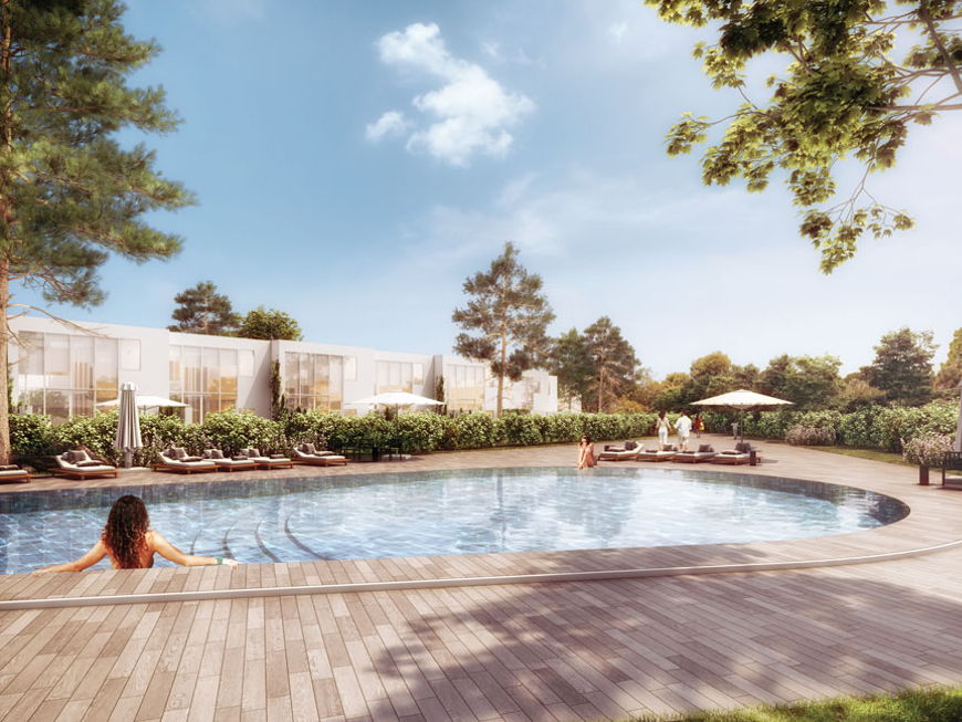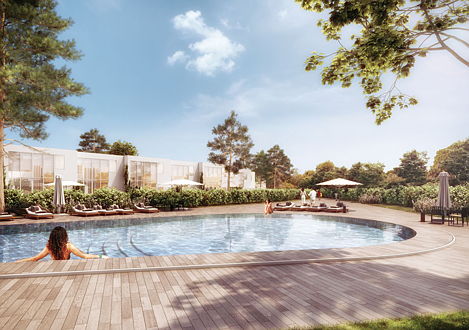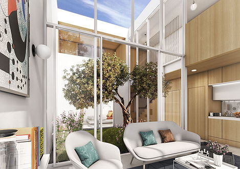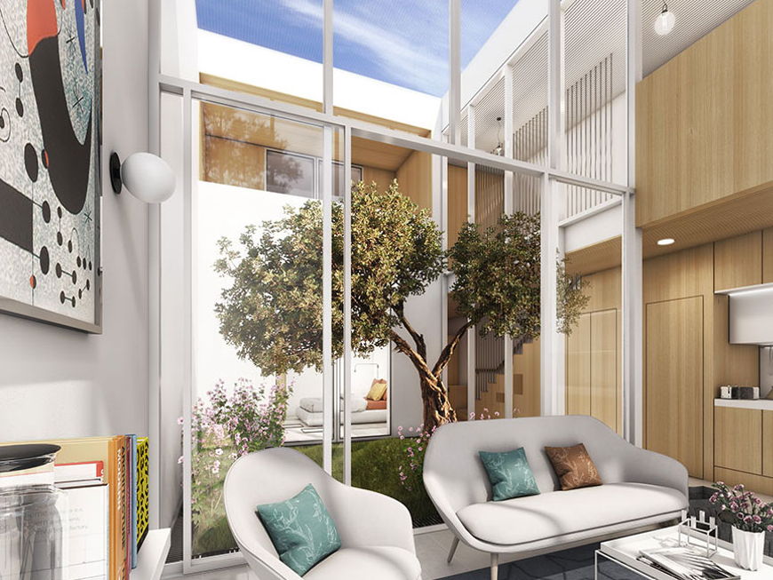 As grandes janelas em vidro e os pátios interiores privativos oferecem aos residentes uma ligação permanente com a natureza, com os jardins comuns circundantes e com a piscina.